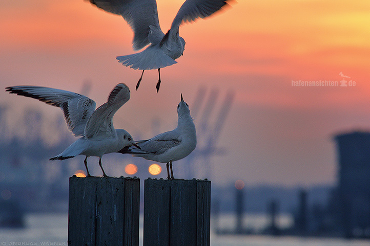 Möve im Anflug zur Landung auf einen bereits von 2 Möven besetzten Poller vor der Kulisse des Hamburger Hafens bei Sonnenuntergang.