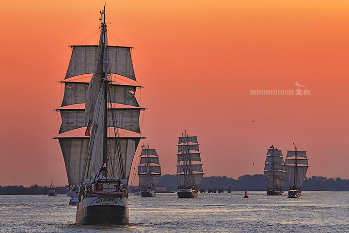 Fünf Großsegler segeln auf der Elbe vor orangerotem Himmel dem Sonnenuntergang entgegen.