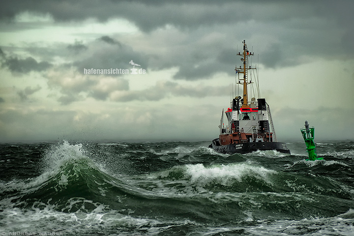 Ein Schlepper fährt auf der Ostsee bei rauer See. Eine grüne Boje / Tonne schaukelt auf dem Meer und die Gischt spritzt sehenswert auf den Wellen. Leuchtboje oder Leuchttonne nennt man so ein schwimmendes Seezeichen das durch Blinklichter in wechselnden Farben und Rhythmen verschiedene Warnungen signalisiert.