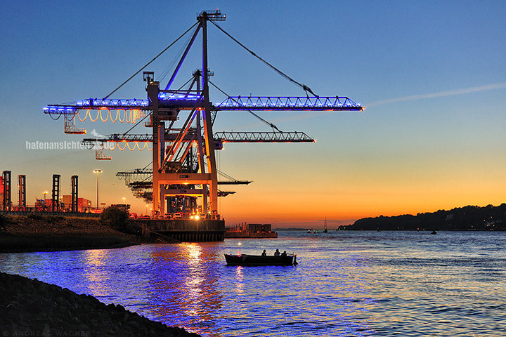 Ein kleines Boot liegt in Hamburg auf der Elbe vor Containerbrücken. Der Himmel hat einen schönen Farbverlauf vom Abendrot zum blau der einsetzenden Dämmerung. Die Ausleger der Containerbrücke sind mit blauen Leuchtstoffröhren illuminiert.