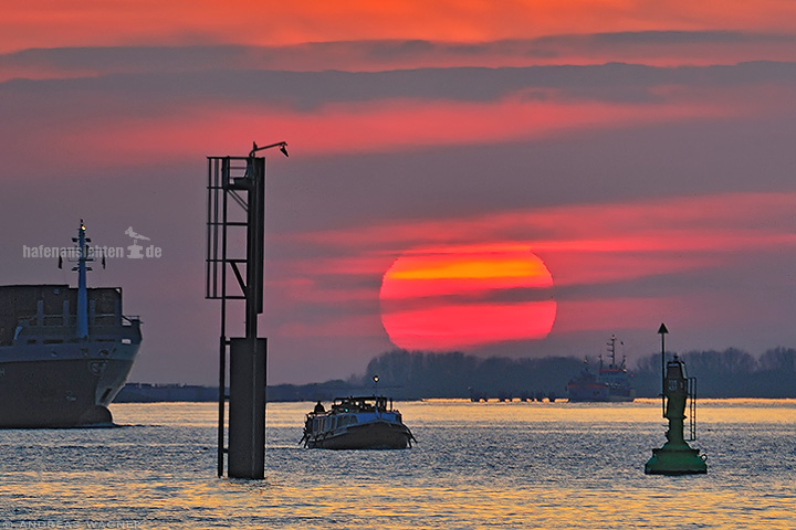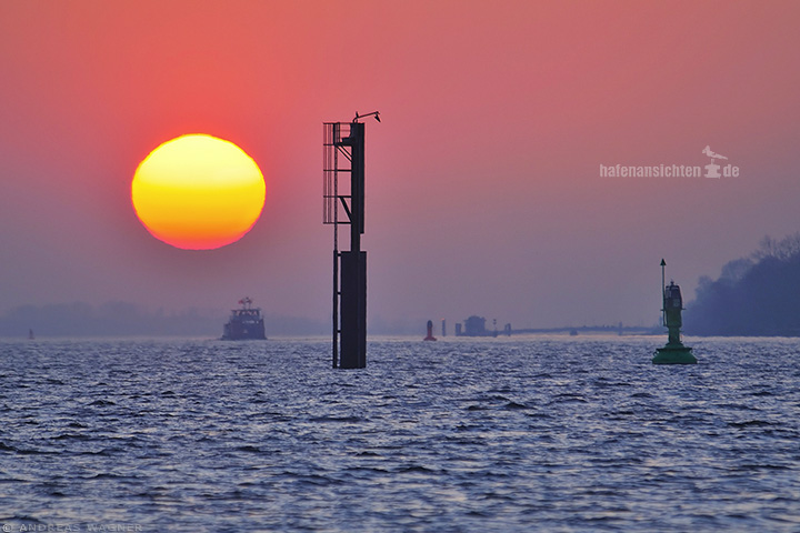 Eine malerische Szenerie auf der Elbe: die tiefstehende Sonne als großer roter Ball wird von ein Dalben mit einem Schifffahrtszeichen und eine grünen Leuchtboje eingerahmt. Davor eine Barkasse. Von links sieht man den Bug eines Containerschiffes kommend. Ein weiteres Schiff im Hintergrund.