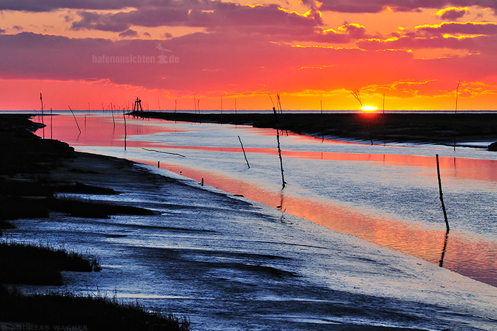 Ein Sommerabend an der Nordseeküste. Die Sonne versinkt im Meer mit einem grandiosen Farbspiel am Himmel hinter der Hafeneinfahrt von Friedrichskoog.
