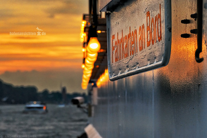 Ein Schild "Fahrkarten an Bord" an einem Schiff das in der Dämmerung auf der Elbe fährt. Eine ganze Reihe von Glühlampen beleuchtet die Außenwand des Bootes und stellt einen schönen Übergang vom bläulich grauen Schiffsrumpf zum rötlichen Himmel des Abendrots her.