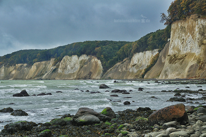 Ein Ausschnitt der malerischen Kreidefelsen auf Rügen. Moosbewachsene Steine am Strandufer und leichter Wellengang auf der Ostsee.