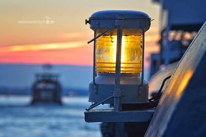 Eine leuchtende Laterne auf einem Schiff vor einem in Unschärfe verschwimmenden Hintergrund mit einer Fähre und dem restrot des Himmels bei einsetzender Dämmerung.