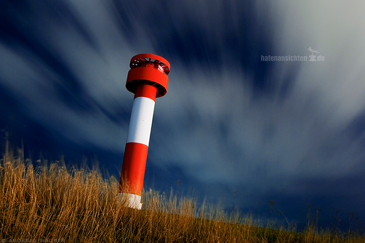 Leuchtfeuer in dynamischer Perspektive vor verwischtem Himmel und wehenden Gräsern.