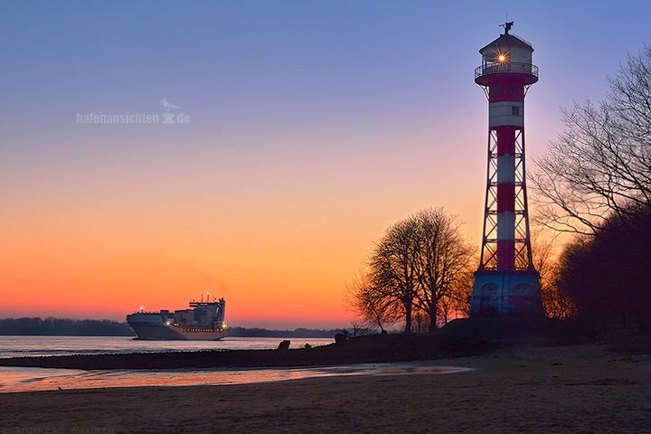 Der Leuchtturm Wittenbergen in Hamburg Blankenese im Herbst in der Dämmerung nach Sonnenuntergang vor dunkelrotem Abendhimmel. Ein Containerschiff kommt die Elbe herunter gefahren.