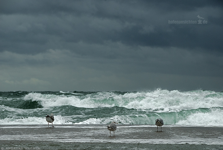 Drei Möven stehen beim stürmischer See und dunkelgrauem Himmel am Strand und schauen auf die wellige Brandung. Es wirkt als könne sich die linke Möve nur mit Mühe halten um nicht weggeweht zu werden. Die mittlere Möve dreht sich zum Betrachter um.