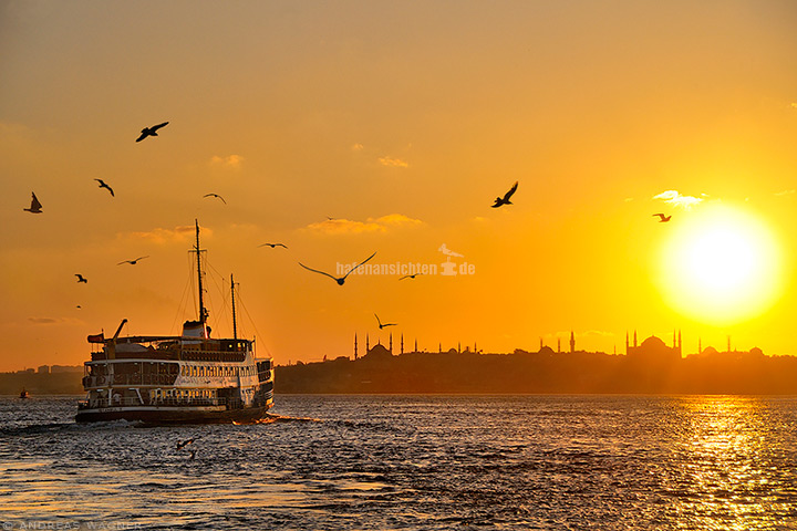 Eine Fähre fährt kurz vor Sonnenuntergang von Kadiköy nach Eminönü auf dem Marmara Meer und wird von umkreisenden Möven begleitet. Im Hintergrund die Silhouette des historischen Zentrums von Istanbul mit den bedeutenden Moscheen (der "Blauen Moschee" Sultan Ahmed, der Süleymaniye-Moschee, der Rüstem-Pasa-Moschee und der Beyazit-Moschee). Darüber die tief stehende Sonne als hell gleißender Ball.