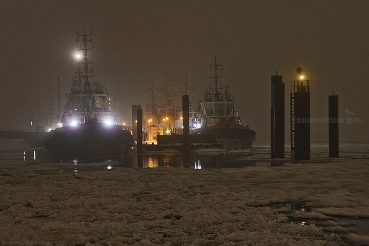 Mehrere Schlepper liegen im nebligen Hafen an der Schlepperstation. Auf dem Wasser treiben Eisschollen. Einzelne Lichter durchdringen den Nebel.