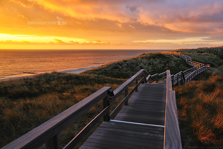 Der malerische Holzbohlenweg in Wenningstedt auf Sylt bei Sonnenuntergang. Der geschwungene Weg durch die Dünen im letztem Licht des Tages wirkt durch seine warmen Farben fast wie ein Gemälde von Caspar David Friedrich.