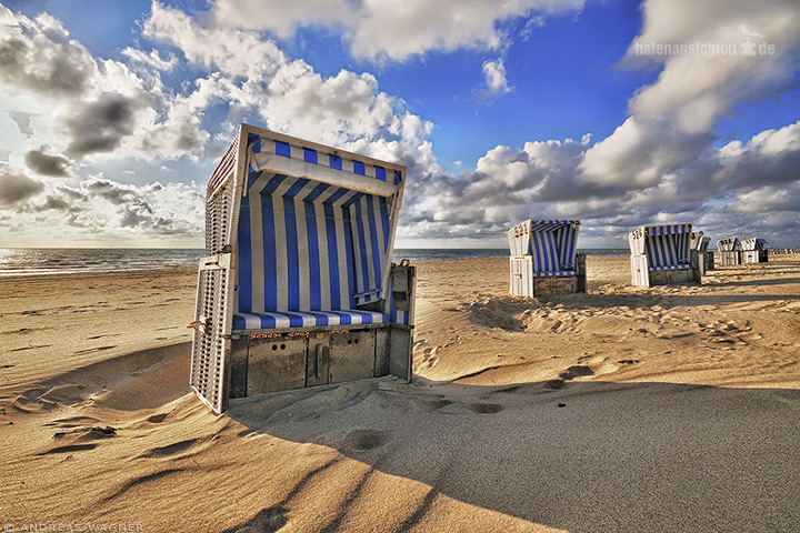 Ein sonniger Strandtag auf Sylt. Mehrere leere Strandkörbe stehen im Sand am Strand von Kampen auf Sylt. Malerische weiße Wolken ziehen am blauen Himmel vorbei.