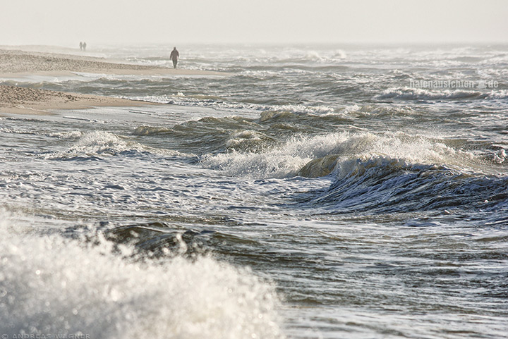 Strandspaziergang auf Sylt bei windigem Wetter und Sonnenschein. Die weiße Gischt tanzt auf den Wellen der Nordsee die sich am Strand brechen und glitzert im Gegenlicht. In der diesigen Ferne sieht man einzelne Spaziergänger am Strand.