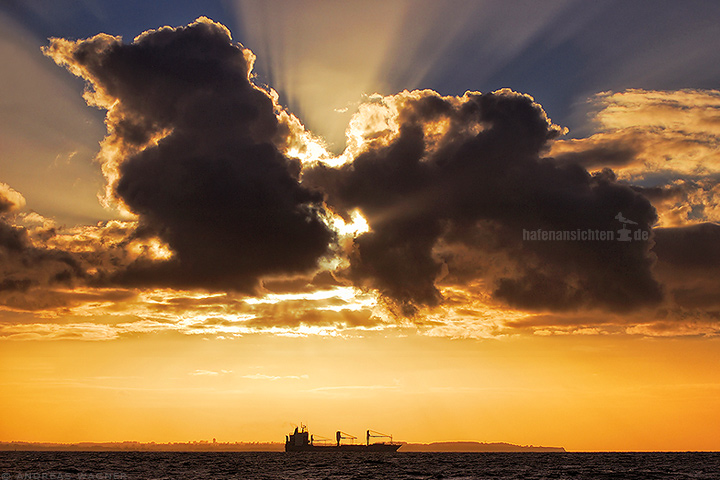 Eine einzelne große Wolke verdeckt die tiefstehende Sonne über dem Meer. Sonnenstrahlen steigen hinter den Wolken empor zum Himmel. Ein Frachtschiff ist als Umriss genau in der Mitte unter der Wolke.