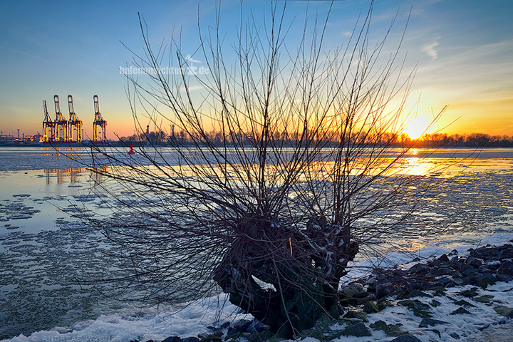 Der Stumpf eines Weidenbaums mit Ästen ohne Blätter im Winter bei Sonnenuntergang an der Elbe auf der Eisschollen treiben. Trotz der sichtbaren Kälte strahlt dieses Foto Wärme aus.