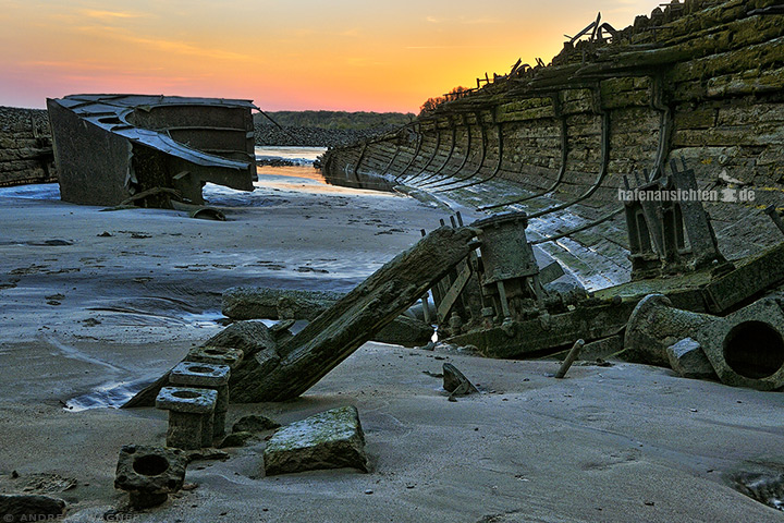Das Wrack des Seglers "Polstjernan" und das Wrackstück eines UBoots aus dem 2.ten Weltkrieg kurz nach Sonnenuntergang an der Elbe bei Niedrigwasser am Blankeneser Ufer kurz vor Hamburg.