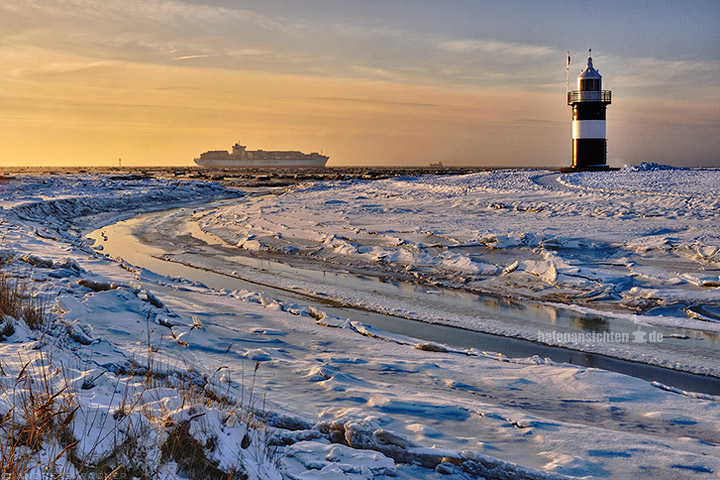 Der Leuchtturm "kleiner Preusse" in Wremen im Winter bei Sonnenuntergang in verschneiter und vereister Landschaft. Am Horizont fährt ein Containerschiff.